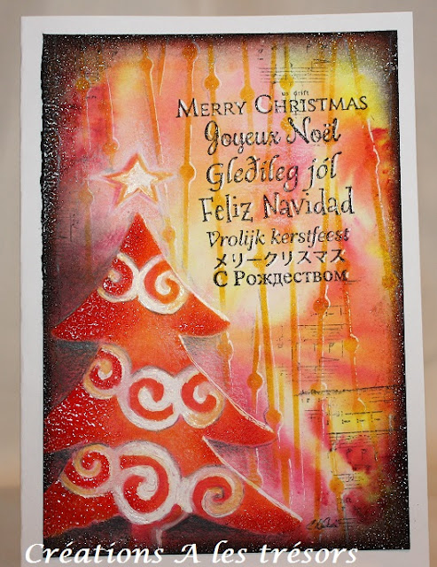 Sur une grande feuille de papier aquarelle 140 lb, j'ai joué avec les Nuances pour me créer des fonds de projets intéressant et colorés. Je coupe ensuite la feuille de 9 X 12 au format que je veux utiliser par la suite, pour cette création, j'ai travaillé sur une surface de 4½ X 6½. Le pochoir de sapin et le pochoir ligné on été travaillés avec les encres Distress. Par la suite j'ai étampé le souhait avec l'encre Versafin Onyx Noir et embossé à la poudre claire. J'ai ajouté de la texture avec l'étampe de partition de musique et j'ai ajouté au sapin de la dimension avec les crayons Prismacolor et encrés tout les contours avec l'encre Distress Black Soot pour un effet plus dramatique !