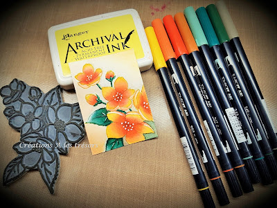 Sur un papier aquarelle Strathmore 140lbs, j'ai étampé les fleurs de pommier avec de l'encre permanente très pâle. La mise en couleur a été effectuée avec les marqueurs Tombow en technique aquarelle.